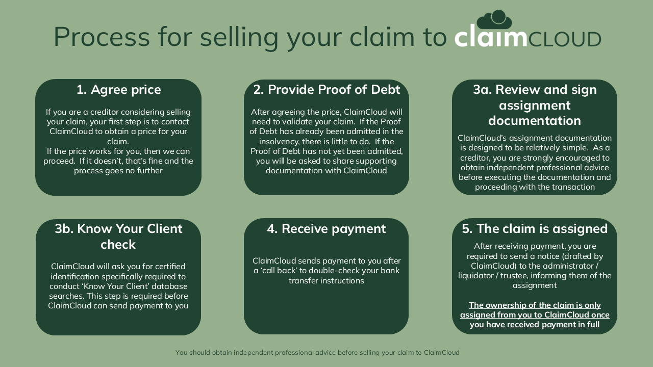 Any information provided by ClaimCloud is not intended to constitute any financial or investment advice. Before you consider selling any claim you have to ClaimCloud, you should consider obtaining financial, tax and investment advice that takes into account your financial circumstances, objectives and needs. You should also consider any information from or published by the company you have a creditor claim with or any appointed administrators or liquidators that may impact your creditor claim.